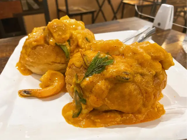 今晚又去九龍城食泰國菜,揀間未食過嘅。呢間叫「泰掂」嘅餐廳環境乾淨企理,細細間但樓底好高空間感十足!一入到去店員就好親切就招呼我哋。【招牌冬蔭功(S)】首先嚟嘅係冬蔭功,叫咗個S都幾大碗喎,兩個人食夠晒,每人飲到兩碗。個湯好香椰奶味,酸辣味平衡,唔算太辣,開邊蝦好大隻好彈牙,飲完個冬蔭功真係好開胃!【泰式串燒 豬/雞 各3串】串燒即叫即燒,上到枱仲聞到灰燒嘅香味,燒到金黃色微焦,雞肉外脆內嫩,比較Juicy,豬肉較有咬口亦唔韌,配埋個沙爹醬好惹味!【咖哩海鮮包】嘩!兩個麵包大大個,淋滿咖哩汁。中空嘅麵包入面有勁多海鮮,有蝦、青口、魷魚,仲有南瓜等,超級豐富!煙韌嘅麵包索晒啲咖喱汁好正。食完呢個真係唔駛再食飯麵,好食又飽肚之選!呢間泰國菜食物非常有水準,分量亦好足,兩個人食咗三樣嘢已經好飽。另外,環境舒適乾淨,食得寧舍relax,嘆埋啤酒邊食邊傾計,又一個愉快嘅晚上。…查看更多