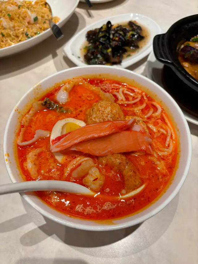 🇸🇬🥢🥣特色新加坡x中菜▫️免茶錢▫️食物份量有大中小選擇☑️餐前小食-雲耳 -$15一坐低就送上餐前小食,雲耳都算大碟,酸酸辣辣幾開胃,呢個份量$15算幾抵。☑️菜香鐵板豆腐(細)-$108呢個收費較貴,豆腐吾算好大件,但入面真係好滑,甘大件炸完都冇爛,真係功夫菜。個調味好好味,下面有蛋,上面有大量肉碎,口感豐富。☑️喇沙湯海鮮米線 -$83喇沙嘅湯底顏色較紅,有d油但唔會好辣,椰汁味都香,湯底惹味,米線軟硬度剛好。配料都唔少,有豆卜、半隻雞蛋、魚片、蝦、蟹柳。蝦都幾彈牙。☑️蝦味魚子蝦球炒飯(細)-$83細嘅炒飯大約可以裝到四碗,都唔算好細,炒得幾有鑊氣,飯粒粒分明,有唔少魚子增加口感。Menu話原來米飯有用蝦湯煮過,啖啖蝦味,齒頰留香,配埋蛋同埋蔥花,味道一流。☑️漁香茄子煲 -$88茄子用煲上超熱咋咋聲,茄子用油泡過幾入味,茄子肉淋只是比較油膩。另有大量肉碎,調味微辣惹味。☑️金銀蛋浸時蔬-$88呢個幾清新,上湯好飲唔會重味精,唔會好鹹。除咗菜,仲有唔少肉碎同埋皮蛋鹹蛋,但如果可以再多啲菜就好啦。☑️脆皮蝦醬雞中翅(細)-$103叫細份但都有8隻,好彩我地有4個人,2人食就太多了。雞翼大隻炸得好香脆,小心熱親,肉嫩,好食的,但唔係好食到有蝦醬味。…查看更多