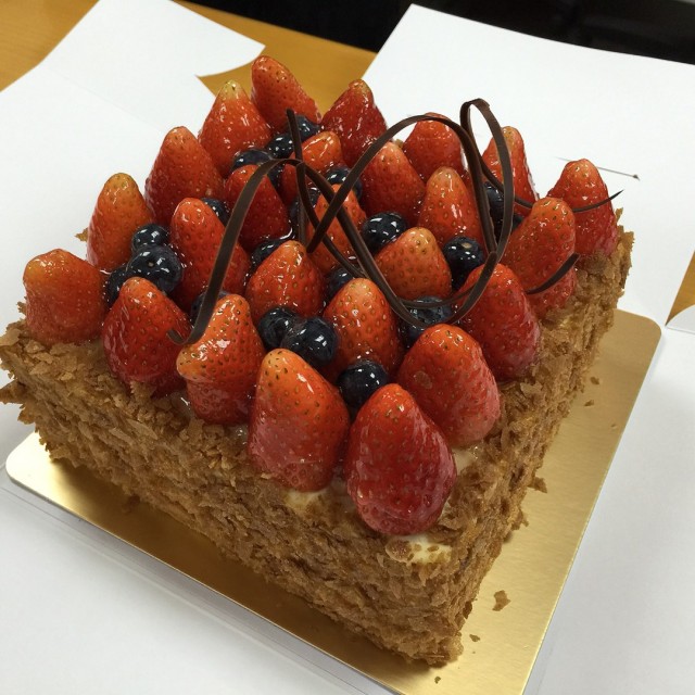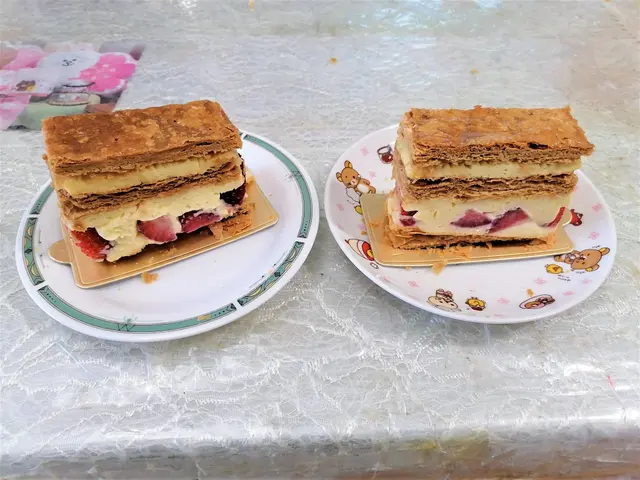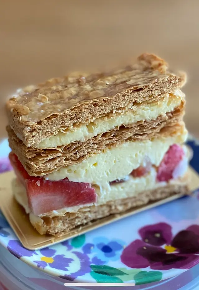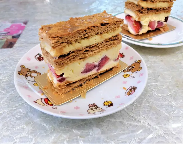 帝苑餅店在帝苑酒店的地下,櫥窗展示了各式各樣精美的甜品,店內的裝修和佈置高雅美觀。這間餅店最出名的是蝴蝶酥和拿破崙,很多人都會專程來購買,另外還有很多其他款精美又美味的蛋糕。酒店網頁會不時有折扣優惠,訂購蛋糕還可以免費加上精美的朱古力生日牌及送上生日蠟燭。為了慶祝生日,我們訂了拿破崙生日蛋糕。🌟雜果拿破崙 ($488)蛋糕上面鋪滿新鮮的雜果,包括士多啤梨、提子、芒果、火龍果、藍莓,中間是香脆的千層酥皮夾著鮮雜果及幼滑吉士忌廉,忌廉的味道不會很甜,和鮮雜果配搭得很好,滋味無窮。🌟士多啤梨拿破崙($488)香脆的千層酥皮夾著新鮮士多啤梨及幼滑吉士忌廉,酸酸甜甜,味道清新又好味。…查看更多