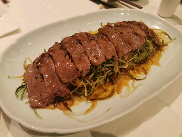 安格斯半熟牛肉沙律~牛肉薄切但有咬口, 牛肉味亦很濃郁, 下面用青瓜絲洋蔥做沙律, 兩者味道很夾。