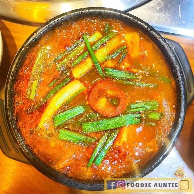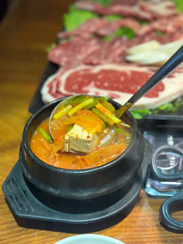 金巴利道韓國街真係好多韓國餐廳選擇🇰🇷 今次試吓呢間主打韓式烤肉既餐廳😛 而家入到去播住韓文節目原來全部係韓國人自己開既🤪 阿珠媽睇落Cool Cool地但係好熱心幫我地剪開D牛肉同埋燒肉🥰仲有佢控制火候好Perfect🔥 烤肉可以選擇唔同單點 但今日就揀左比較抵既套餐🎊⭐️ 牛肉拼盤B 🥩總共有四款牛肉🐮 最特別係特級牛肋骨同埋醬醃牛肋骨🍖 原條咁上超長😋 咬落牛味濃同埋富油香🧈 配上蒜片用生菜包住食夠正宗🥬 醬醃板鍵肉同埋牛肋骨肉口感就比較淋 食得出肉質有水準👍🏻⭐️ 泡菜湯 🍲冬天食碗溫暖嘅泡菜湯真係好正🌶 有滿滿嘅豆腐蔬菜同牛肉真係好足料😛…查看更多