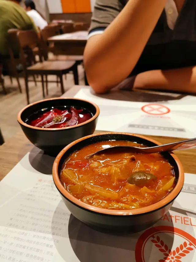 。因為我哋都差唔多成8:30pm先過嚟,加上又喺星期日晚,東薈城二期呢邊好靜吓,走進餐廳客人都唔多。餐廳環境四四方方,裝修、格局都比較簡約,木枱櫈,配襯灰橙為主調。餐具放晒晌枱側拉櫃桶,一派茶記設定。但店員唔會主動提供熱水,不過,你要求嘅話都絕對好快送上,搵啲熱水洗洗餐具消消毒,喺依家啲生活常態。枱上有張紙餐枱墊,特別有一大段文字介紹羅宋湯點樣引入到嚟香港,羅宋湯個名嘅由來