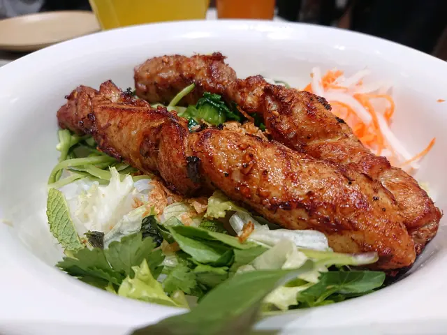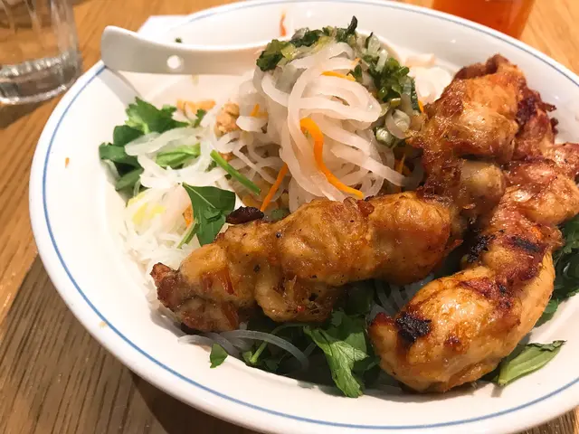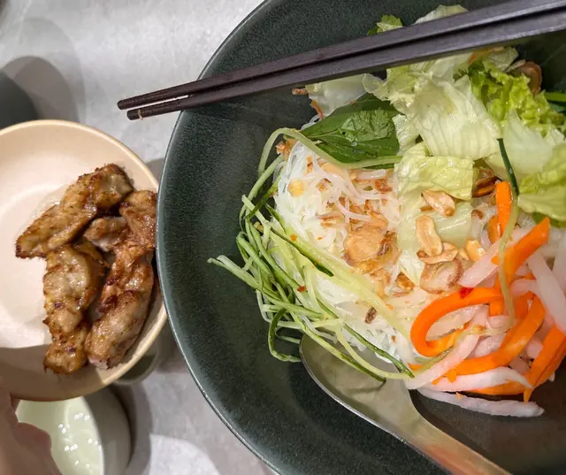 大概六點鐘左右,未到正式晚飯時間,見到呢間裝潢幾別緻比起其他分店多左一份小清新既感覺餐廳內空間感十足,樓底高,係正商場中央,較為通透不過可惜座位之間並唔算寬落,四人枱之間只係隔左一條好小的空隙基本上同搭枱無乜分別,當時食飯左右兩邊都坐左人,所以有點逼服務方面,點餐都係自己手機落單,隔左十分鐘左右就上菜食物評價燒豬扒撈檬 $95每次黎食都係食撈檬,因為佢既配菜好足,芽菜生菜蘿蔔絲花生都比足感覺上都比較新鮮同無咁油,佢既魚露味道偏淡,落左半枝先夠味至於豬扒,口感唔錯,肉唔會太鞋又有少少汁,食落口第一淡有少少甜味可能係醃左D汁既味道,不過整體都係好食燒雞撈檬 $95燒雞份量相對較少,畢竟個價錢並算平,只係比得2串雞肉分量但係雞肉都係嫩口同埋滑,所以都係好味整體而言,越南菜黎講價錢偏貴,但係餐廳環境相對較為乾淨服務黎講亦都無乜,手機落單,比錢都係自己拎張單出去,咁都要加10% ,不過論食物黎講都係好食,值得推介
