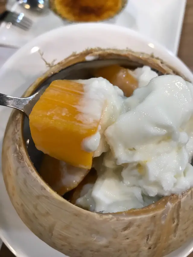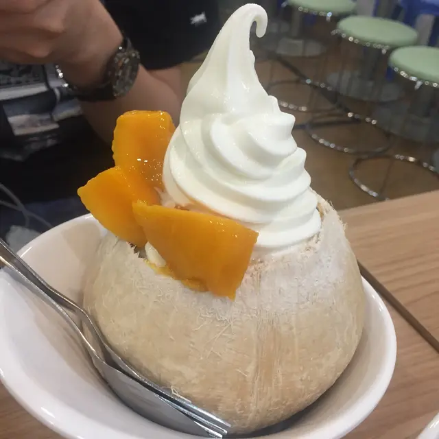 難得黎到元朗探朋友,梗係宵夜直落啦,減肥都係留返下次先🤭。朋友住喺洪水橋附近,由佢帶路捐窿捐啦搵食,就帶左我去呢間糖水舖。坐低望望餐牌,原隻椰皇已經完全吸引住我,仲要有北海道3.6軟雪糕,同平時食開其他糖水鋪整既椰皇甜品完全唔同,今晚就一於試吓呢個芒果爺爺!果然係用北海道3.6牛奶做雪糕,牛奶味特別香濃,又夠滑,食落去真係唔同㗎。中間又有好多大大舊既芒果,芒果夠甜,好好食。但最估唔到既係底層,用上椰皇既汁整既果凍,食落有陣陣椰皇既清甜,少少爽口,好清新既感覺。兩個人開心share岩岩好!叫多左個D24榴槤班㦸,未食已經聞到榴槤飄香。食落口榴槤既味道濃郁,果肉多過忌廉,皮薄饀靚,正!…查看更多