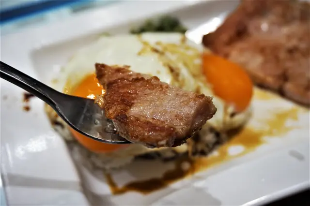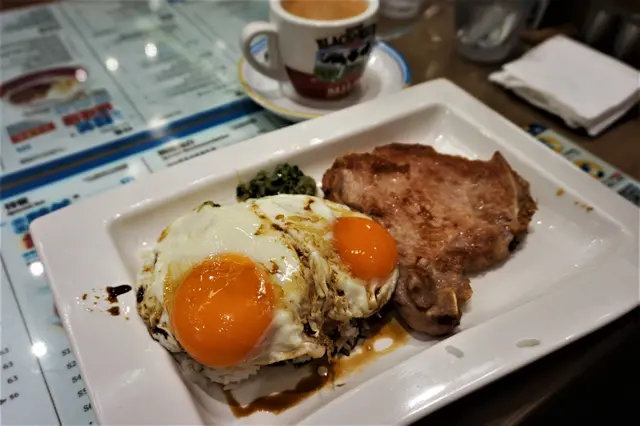 我嘅蔥油豬扒飯就算正常得多,有骨豬扒大大件,煎得金黃,仲有點焦香,入口亦都夠晒鬆化,煎雙蛋可以轉其他煮法,叫咗太陽蛋,蛋黃煎得比較生,半凝半結咁,啱晒我,將蛋黃撈飯再加埋蔥油,真喺完美嘅組合。