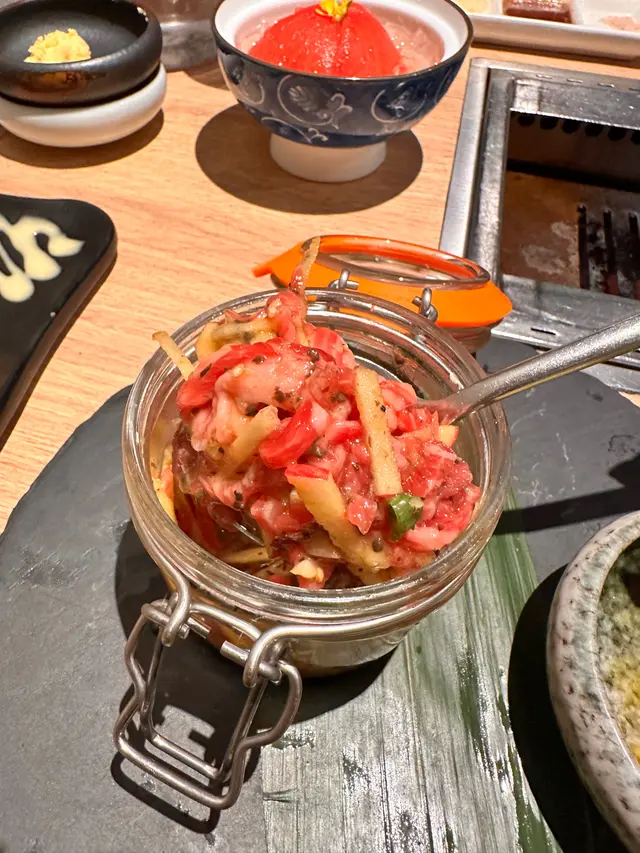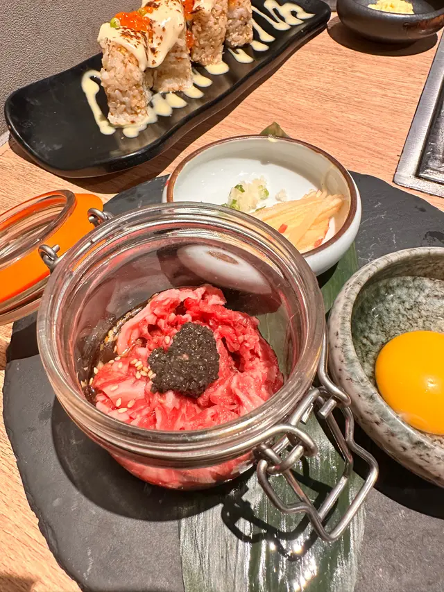 喜歡吃牛的,可以嚐嚐這間餐廳,有美國、日本和澳洲的優質A5和A4和牛外,還有其他部位提供的呢~餐廳有一少女風壁畫在內,每張桌都設有烤爐。前菜有中華沙律和泡菜,而醬汁有鹽、燒汁、蒜蓉。服務方面,我們不知道怎樣燒,職員都很樂於教導、示範。 ♡揚櫻花蝦豆腐$68 🥢必點🥢金黃色的外皮,外脆內軟的口感,味道十分香口,帶有櫻花蝦的香味。 ♡櫻花蝦餃子$68餃子外皮帶點香脆,櫻花蝦份量非常多啊!吃下口腔裏都是櫻花蝦的香味。♡蘋果木煙燻松露和牛他他$158 🥢必點🥢用一透明玻璃瓶子放置和牛他他,上菜時職員叫我們盡快食用,確保新鮮。把蘋果條、香蔥、蒜蓉、雞蛋再加上松露和牛他他,全部食材攪拌一起,就可以吃了!我們都是第一次吃,所以很有期待又有點擔心,因為本來有點怕生肉。不過吃下去沒有一點腥味,肉質也很軟腍,還帶有juicy的肉汁,加上蘋果條的口感和果味,很值得一試啊! ♡M6和牛牛板腱$198不愧是M6和牛啊!未燒的時候顏色已經非常鮮紅、紋理分明,和牛上放有蒜蓉,燒到差不多的時候就可以加上去,吃下更惹味。 ♡香蔥薄切牛舌(七枚)$82牛舌咬下去很有質感,牛舌燒了半熟的時候可以加上香蔥下去燒,會帶一點刺激的味道。 ♡全天然豚肉五花腩(八枚)厚切跟生菜$130 🥢必點🥢帶有脂肪的五花腩,可以看到層層分明的肉質,咬下去帶有油脂香味,肉味濃郁,配有生菜,可以包住吃,解油膩感。 ♡松露肉碎炒飯$108可以選牛肉或雞肉,我們點了牛肉,表面有松露醬汁、香蔥、芝麻,我們把所有食材攪拌一起再吃,飯本來已經加了醬汁下去炒,所以味道不會太單調。加用上石頭鍋,有保温效果,吃的時候熱騰騰的。 ♡乳酸梳打特飲$48乳酸加上梳打,味道不會太甜。 ♡韓國麥茶(冷飲)(可添飲)$38一大支其實都足夠喝,還可添飲呢!有濃郁的麥香味,可解油膩感。 ✔️餐廳設加一服務費…Read More