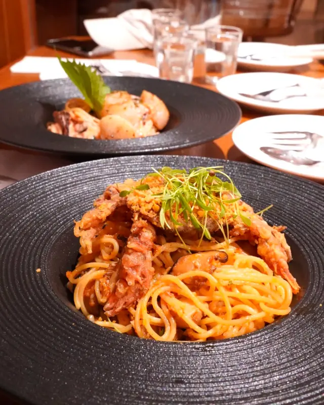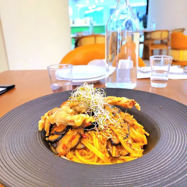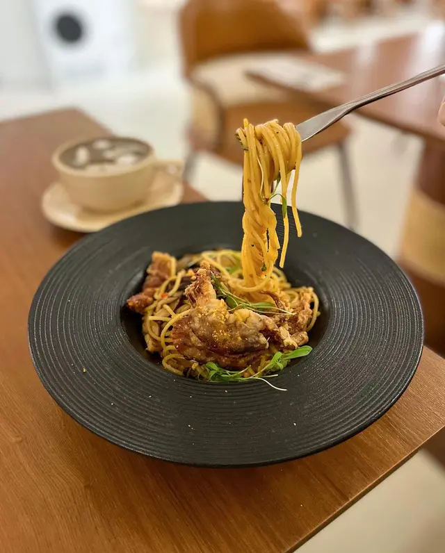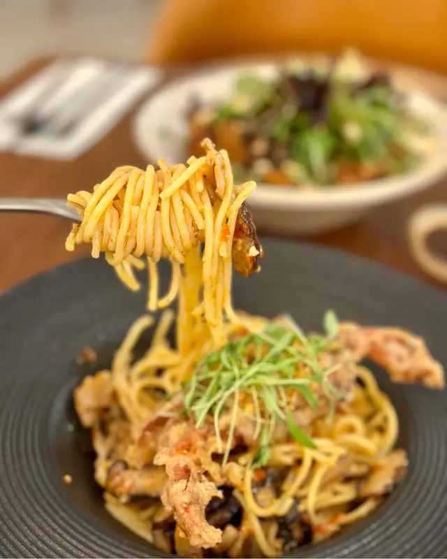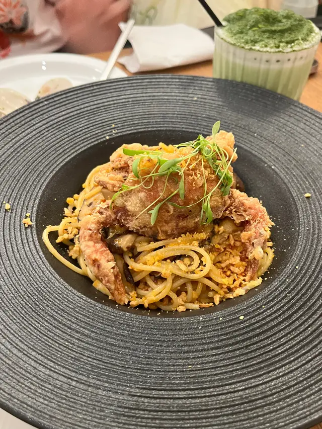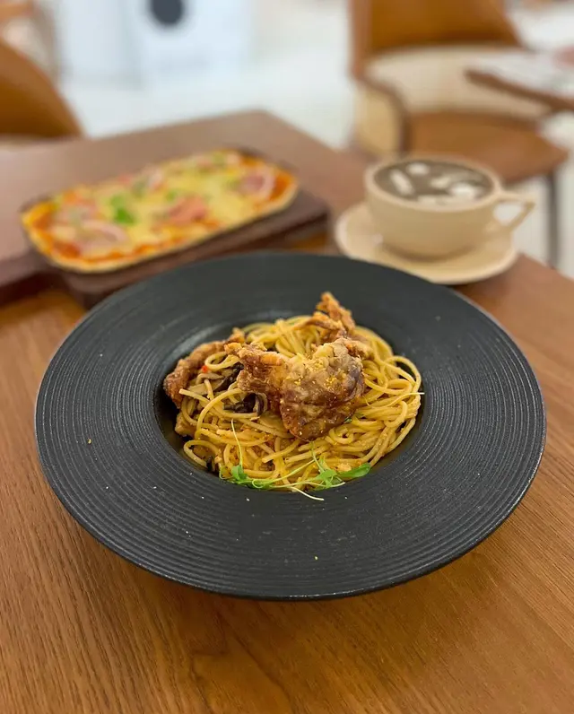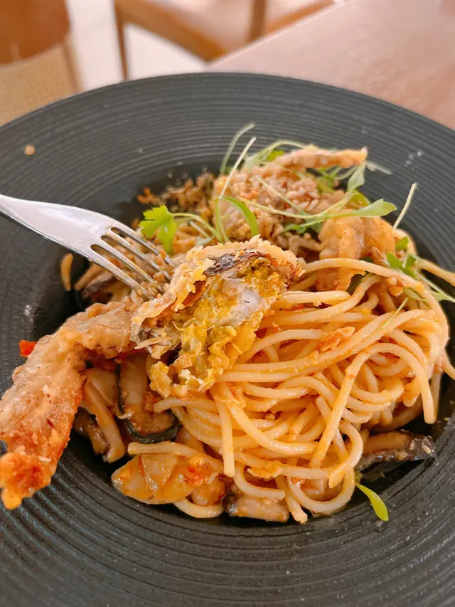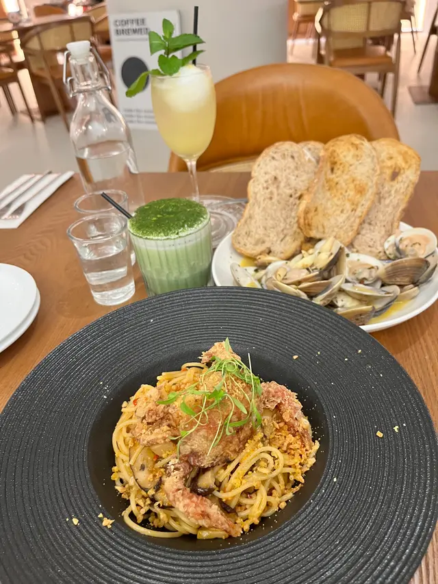 特意選了間空間感大的cafe可以好好放鬆(*´ω`*) ✿ 避風塘香辣軟殼蟹意粉 $128 (另加一)軟殼蟹香脆,炸皮不過厚咬開後,蟹肉肉眼可見意粉軟硬適中、香辣開胃😍稍微偏油,不過避風塘口味就應該是這樣?😂 ✿ 香煎紐西蘭肉眼扒配精選雜菜及法式芥末醬 $208 (另加一)五成熟,顏色紅潤,靜置步驟做得好,無血水肉質軟嫩,肉味濃,調味適中也有配上額外胡椒和鹽芥末醬是溫和的,帶甜味,挑食的友人也很喜歡雜菜也是多汁清甜😋整碟都是十分高質 ✿ 開心果麻糬卷蛋 $68 (另加一)意想不到地濃郁😳連蛋糕本體也嚐到開心果當中還有一層開心果醬,開心果味💯藏有兩塊麻糬,很煙韌!忌廉質地有點特別,像雪糕(? 總之不厚重,不錯的🤤蛋糕頂部的芝士奶蓋也是不馬虎,好吃😍 他們的芭菲和提拉米蘇,看起來也很美味下次於下午茶時段來嚐嚐😍 …查看更多