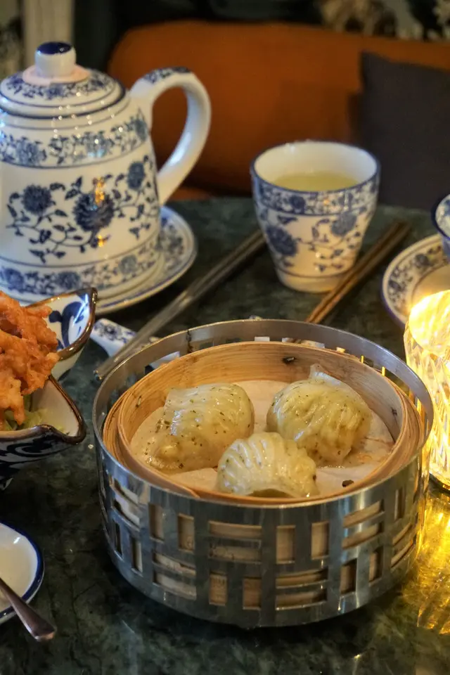 海外分公司派了老外同事到港開會, 公司特意安排到灣仔百年歷史建築物地標食中菜dinner, 有幸陪食。從地面一個小小樓梯口行上長樓梯, 全層以雀鳥牆紙做佈置, 環境氣氛高尚, 復古又帶點西化, 有別於一般中式酒家。餐廳最裡頭仲有個酒吧區, 供應多款調酒飲品。唔飲酒嘅都有Mock tail選擇。中菜OMAKASA 每位HK$1,888+10%另外點了兩款港式點心比老外同事試試。雨前龍井蝦餃 HK$98: 餃皮同埋餡料都混入咗龍井茶葉碎, 餃皮薄, 蝦肉餡料爽口多汁, 偏鹹些少。炸魷魚鬚: 皮炸得酥脆, 雖然魷魚鬚爽, 不過味道過鹹, 配酒邊飲邊食, 可能味道會balance d。食過兩款點心, 就開始OMAKASE喇!第一碟集合三款小食: 花雕醉鮑魚: 花雕提升咗鮑魚本身幾鮮甜, 口感彈滑。荔茸帶子: 外層脆皮鬆化, 一咬綿密芋泥中包住原粒帶子。炭燒叉燒: 半肥瘦叉燒好林, 表面有好甜嘅蜜汁, 細味有微炭燒香。日本鮮響螺燉花膠: 清甜滋陰潤肺, 響螺仲好爽滑。25年新會陳皮蒸豉汁鷹倉: 倉魚切片帶厚度, 面層加咗新會陳皮、青蔥、豆豉醬, 看似係重調味, 但食落反而調味偏淡, 嫩滑魚肉夾集調味配料食, 提鮮又有層次。陳皮意大利黑醋骨: 每粒骨炸皮還是keep到脆身, 表面平均有黑醋汁包住, 味道超甜, 但陳皮味唔太突出…鮮菌炒時蔬: 爽脆甘甜, 菇菌都係甘甘地。鳥語茶香: 以煙薰濃罩住, 上檯開蓋, 濃郁煙薰味四散; 將豉油淋上雞件, 雞件鮮嫩鹹香, 帶有很重煙薰味。 紅寶玉石: 原個去皮蕃茄中釀入炒飯, 輕輕切開蕃茄, 質感超林又多汁, 再淋上黏滑微酸甜茄汁, 跟入面炒得粒粒分明飯底撈埋一齊食, 好似食緊茄汁炒飯, 甜酸開胃。廚師精選甜品: 有如西瓜般賣相, jelly口感彈滑微甜, 配有酸梅粉自己沾黎食。…查看更多