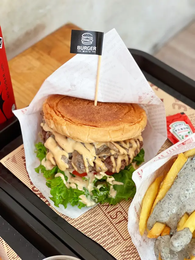 一個令人有「記憶點」嘅 BURGER !!! 一個令人愈食愈幸福感覺滿瀉嘅漢堡 !!!小店每日只會總共供應 200 個漢堡~ 一賣晒就無得食架啦~ 好在今日同友人去到都仲有機會食到佢! 真係果然無得頂 !!! MY PERFECT BURGER!餐牌上都有很多不同配搭的選擇~ 於是我問外藉老闆有什麼好推介他推介了我和牛漢堡及黑松露的mix & match~ 今次我揀左黑松露蘑菇安格斯牛漢堡,黑松露薯條,友人就選了香脆雞扒漢堡~ 老闆向我地說明,由麵包至到牛肉都係一手一腳自己揀料整同處理~ 保證日日都新鮮麵包包皮都係自己選粉再整出黎~ 所以呢間店食嘅漢堡包的包皮同坊間係完全唔同~佢地嘅牛肉係採用USDA PRIME嘅牛肉整成呢個漢堡扒~ 肉嫩USDA PRIME 牛肉是最高等級牛肉級別~ 而且油花、肉嫩度、多汁濃郁,所以呢度用呢款牛肉整嘅漢堡扒真係寧舍好食!!!黑松露方面,老闆曾經試過購入意大利的黑松露,但係佢覺得意大利的味道唔夠法國生產嘅咁出色所以小店採用法國出產嘅黑松露~ 而製成之松露醬~黑松露蘑菇安格斯牛漢堡 HK$125- 絕對物超所值~ 根本係食到材料有幾咁新鮮~ 老闆一上菜見我係咁影相都提我快D食左先~ 凍左個肉味就會有唔同~!!! 所以我都拿拿臨食~ 一咬落口~ 真係FULLY SATISFY ~ 個肉味濃,多汁,不油膩,加上黑松露醬,配以蕃茄生菜芝士~ 就連我平日唔鐘意食嘅酸瓜都可以咁好食加埋呢個外皮~ 真係大癲~!!!!!!!!!黑松露薯條 HK$65- 呢個薯條~ 平日出面食個D最多比DD你點下~ 呢度又係大癲之作~ 根本就係瀑布或咁多醬~ 呢度嘅松露醬真係太好味~ 一條接一條~ 食唔停口~!!!香脆雞扒漢堡 HK$98- 呢個包入面嘅醬原來係配Gordon Ramsey 出品之醬汁~ 但雞扒方面就有點鞋口~ 友人說這個就有一丁點咸了~ 但麵包皮友人都好滿意~ 畢竟外面沒有人以呢款包皮製作漢堡!!!呢度真係有機會~ 我一定會再來吃! 所有野都太有記憶點! 太好食啦!!!📍Burger Mate尖沙咀金巴利道78號金輝閣地下A號舖…查看更多