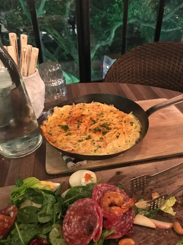 Preferred the brunch experience because of the large windows, the light and the trees. Dinner is darker and noisier. Brunch好心D:落地玻璃、光猛,比較舒服,夜晚較暗。Highly recommend the Elote, it looks super simple and expensive for what it is but take it as a treat and order it. 一定要試個粟米,好似好簡單比較貴,但一次半次都值。The Snowboard is huge and not really a salad but if you want something adventurous go with this. 個Snowboard沙律好大,其實唔算沙律,感覺幾特別,可以試。The Carbonara pie is very nice. It's creamy but not heavy. Also perfect for sharing. Carbonara pie好正。好多醬又唔膩唔鹹,一班人食最好。Make sure you get reservations. 記得訂位。…查看更多