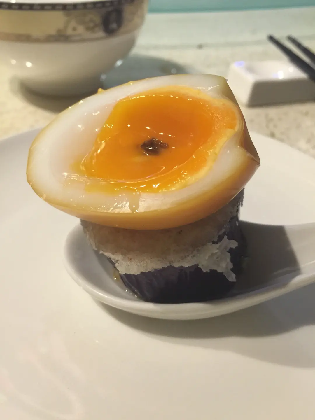 茶燻流心蛋伴黑魚子醬配厚切茄子