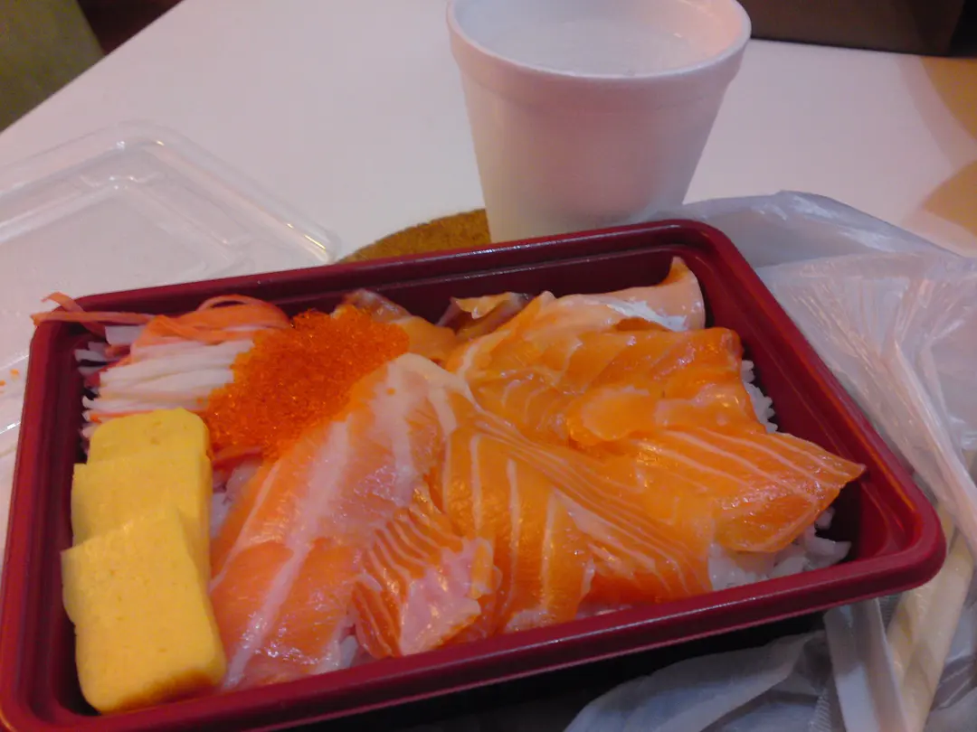 三文魚生飯便當, 後為汽水 7up 一小杯, 兩三口就喝完了...