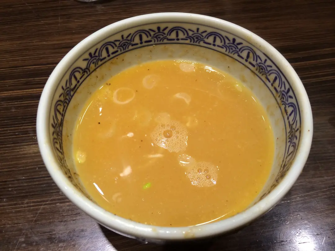 吃完麵後加入熱湯,將沾麵汁兌成魚介豬骨湯。