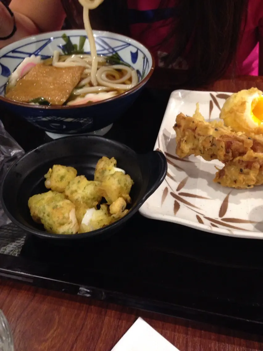 腐皮烏冬,墨魚天婦羅,玉子天婦羅,黑椒雞肉