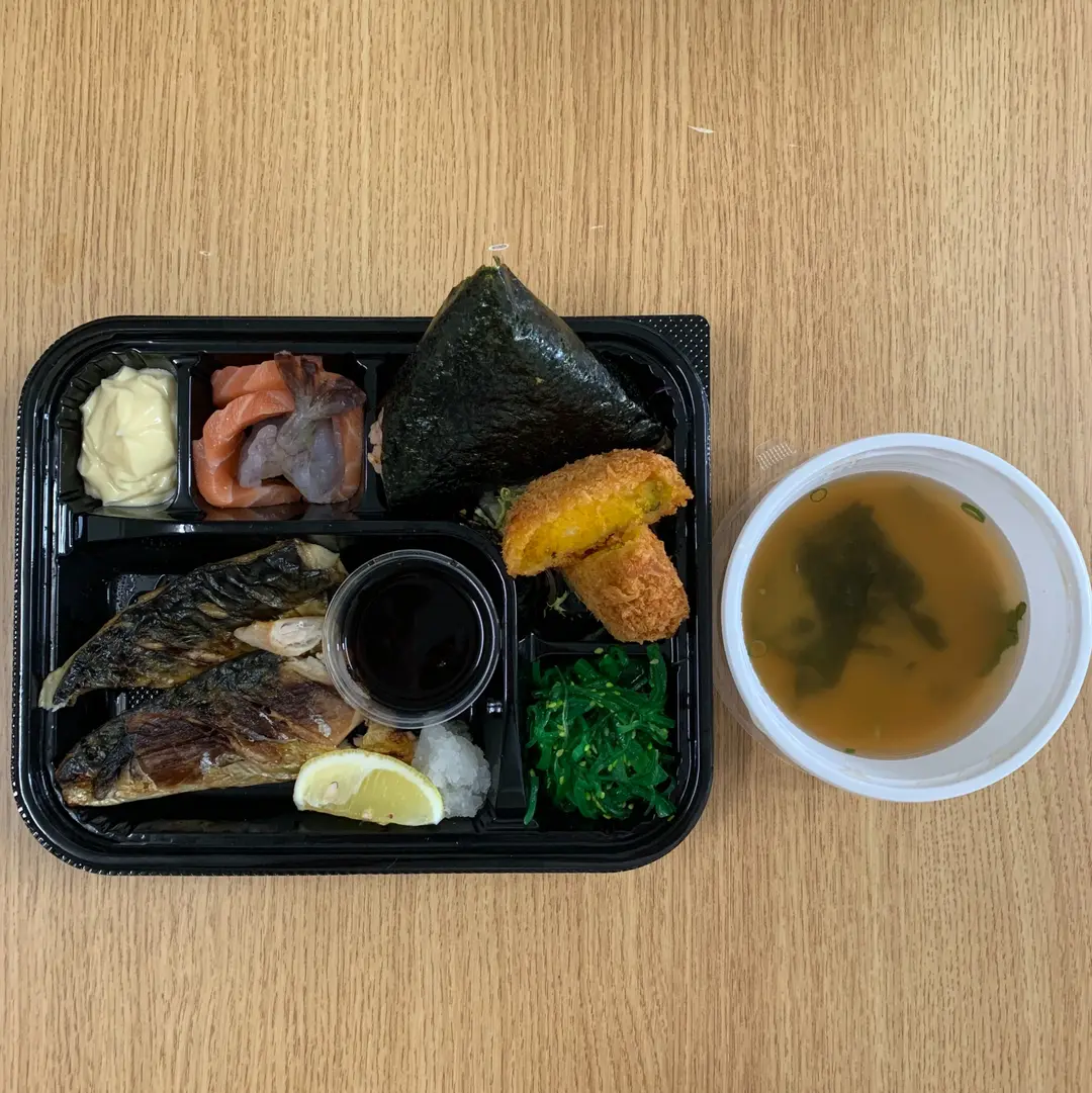 鹽燒鯖魚配吉列南瓜薯餅,三文魚飯糰