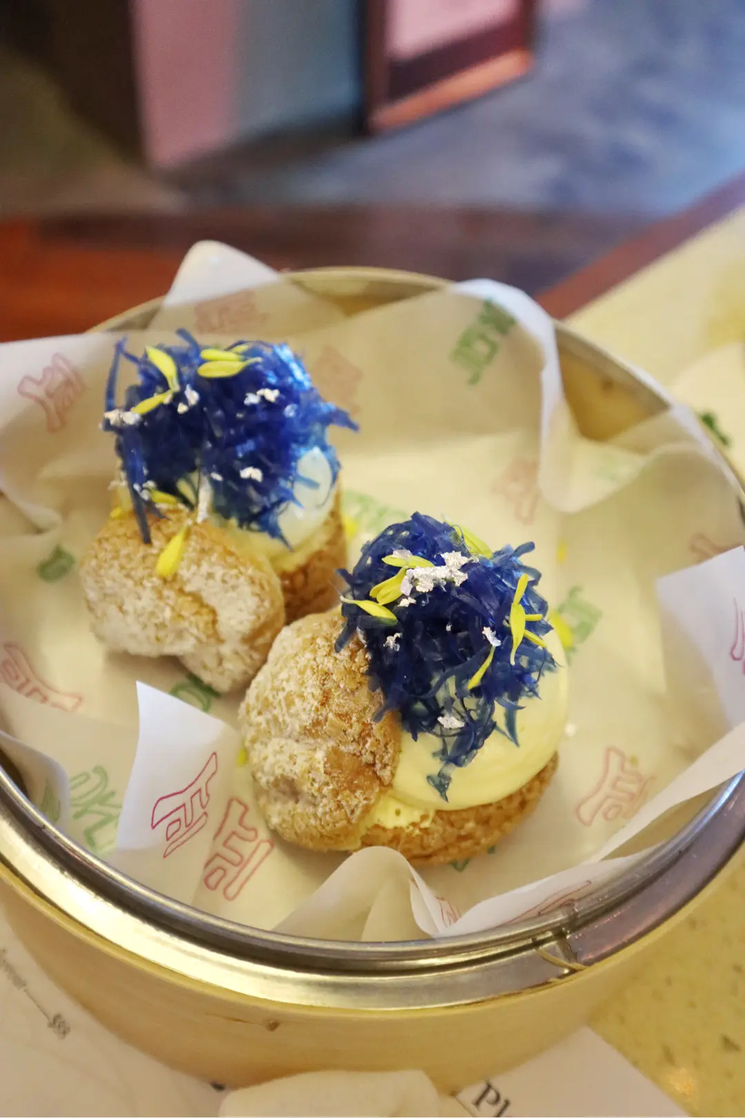 巨大泡芙配菊花芝士忌廉干蝶豆花蜜糖絨毛丨乳酪脆粒