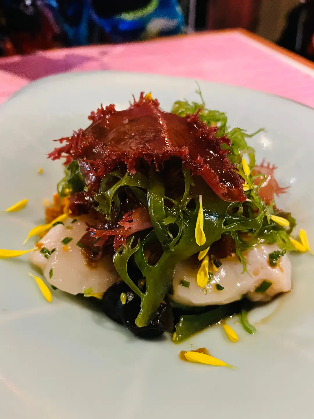 港式生腌北海道帶子,配特選三文魚籽,清爽中華海草沙津,迷你雲耳,老油條脆粒