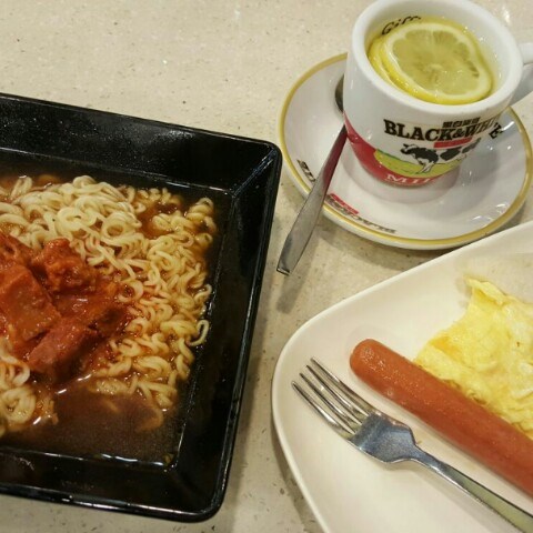 五香肉丁公仔麵、腸仔蛋牛油方包、熱檸水