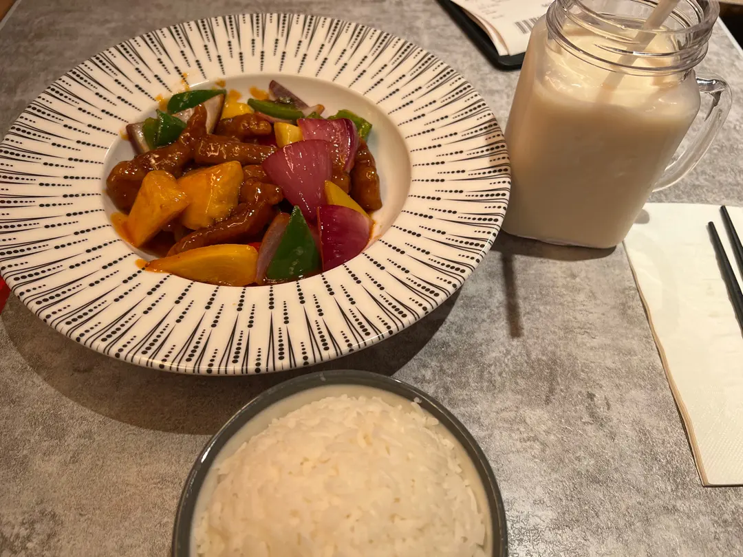菠蘿咕嚕黑豚肉客飯+ 豆漿