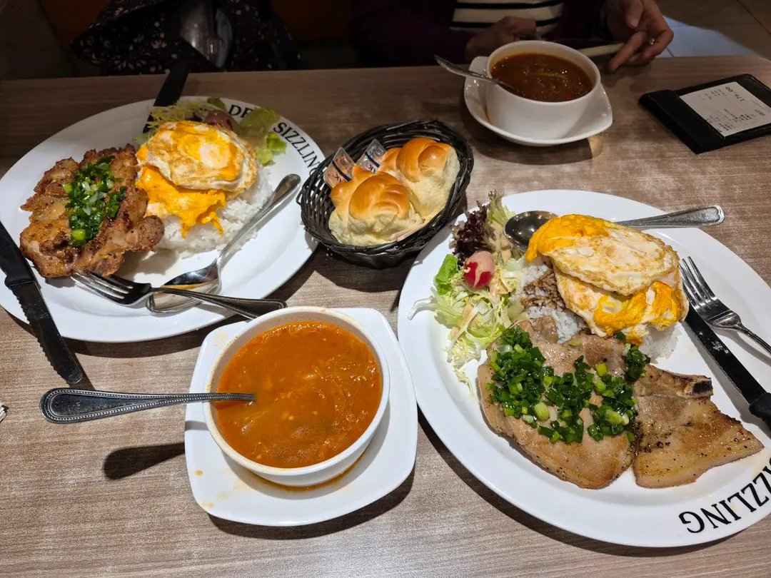 蔥油雞扒配煎雙蛋飯, 蔥油豬扒配煎雙蛋飯, 配餐湯 及餐包,還有餐飲