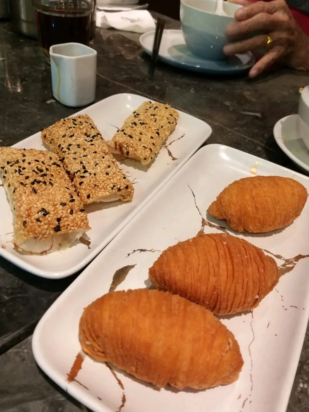 芝士蘿蔔千絲酥及黑芝麻豆漿脆筒