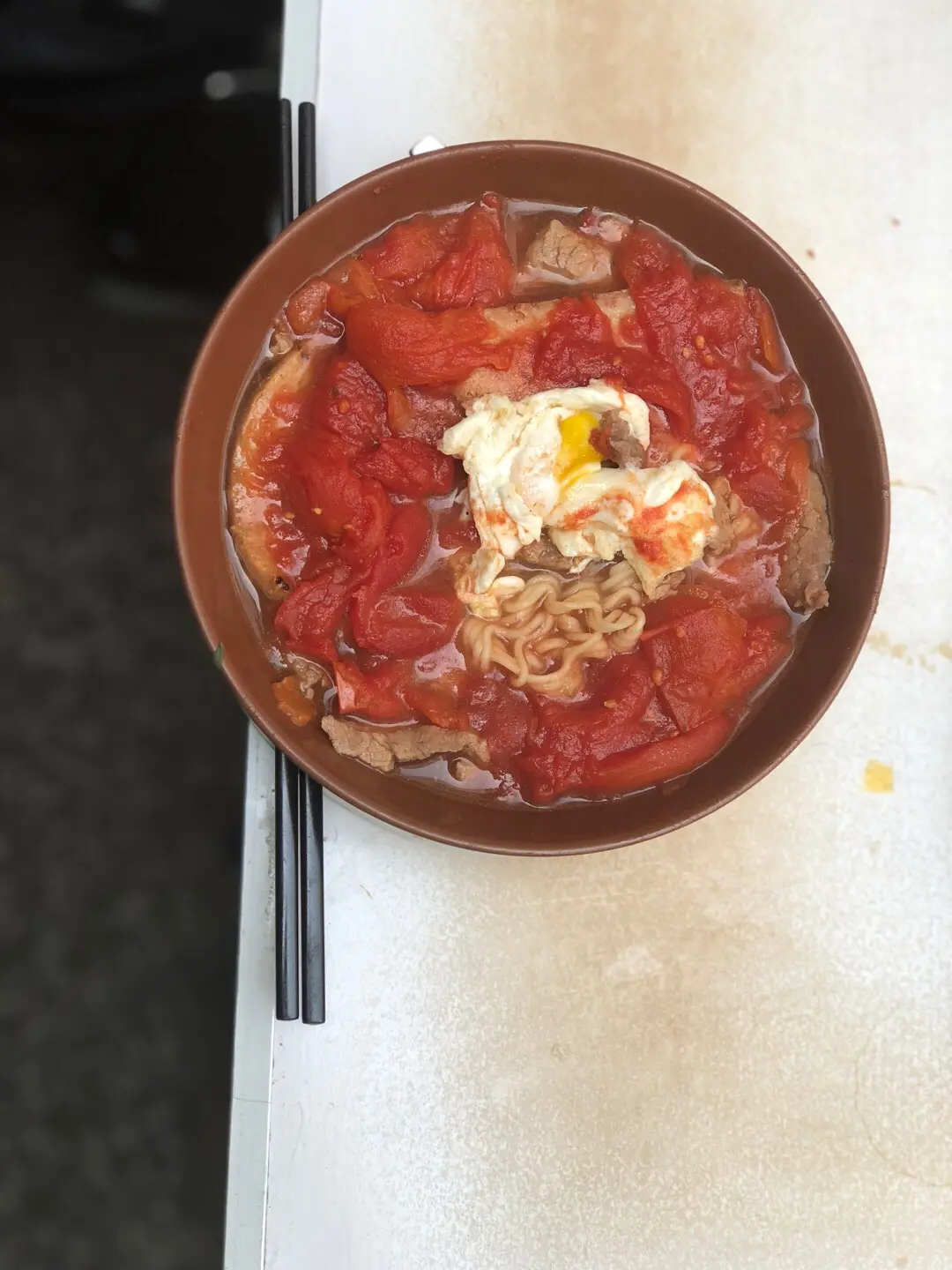 Instant noodle with tomato, beef, pork chop, and egg