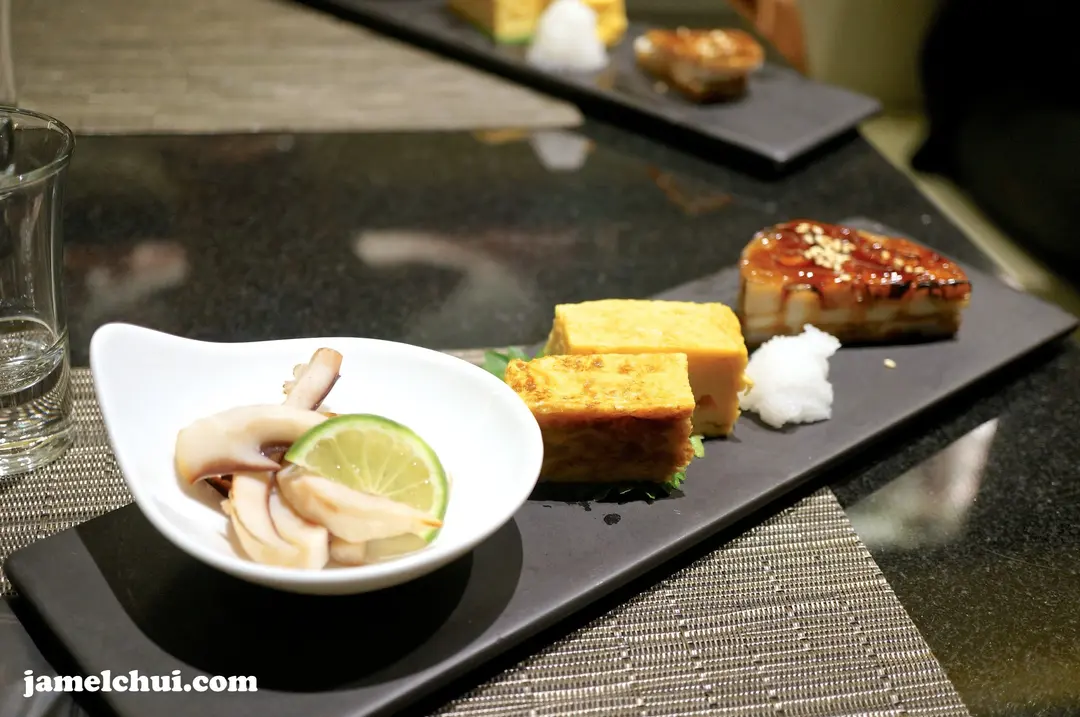 魚肉蓮藕餅。炙燒魷魚。千両特製厚燒甜蛋