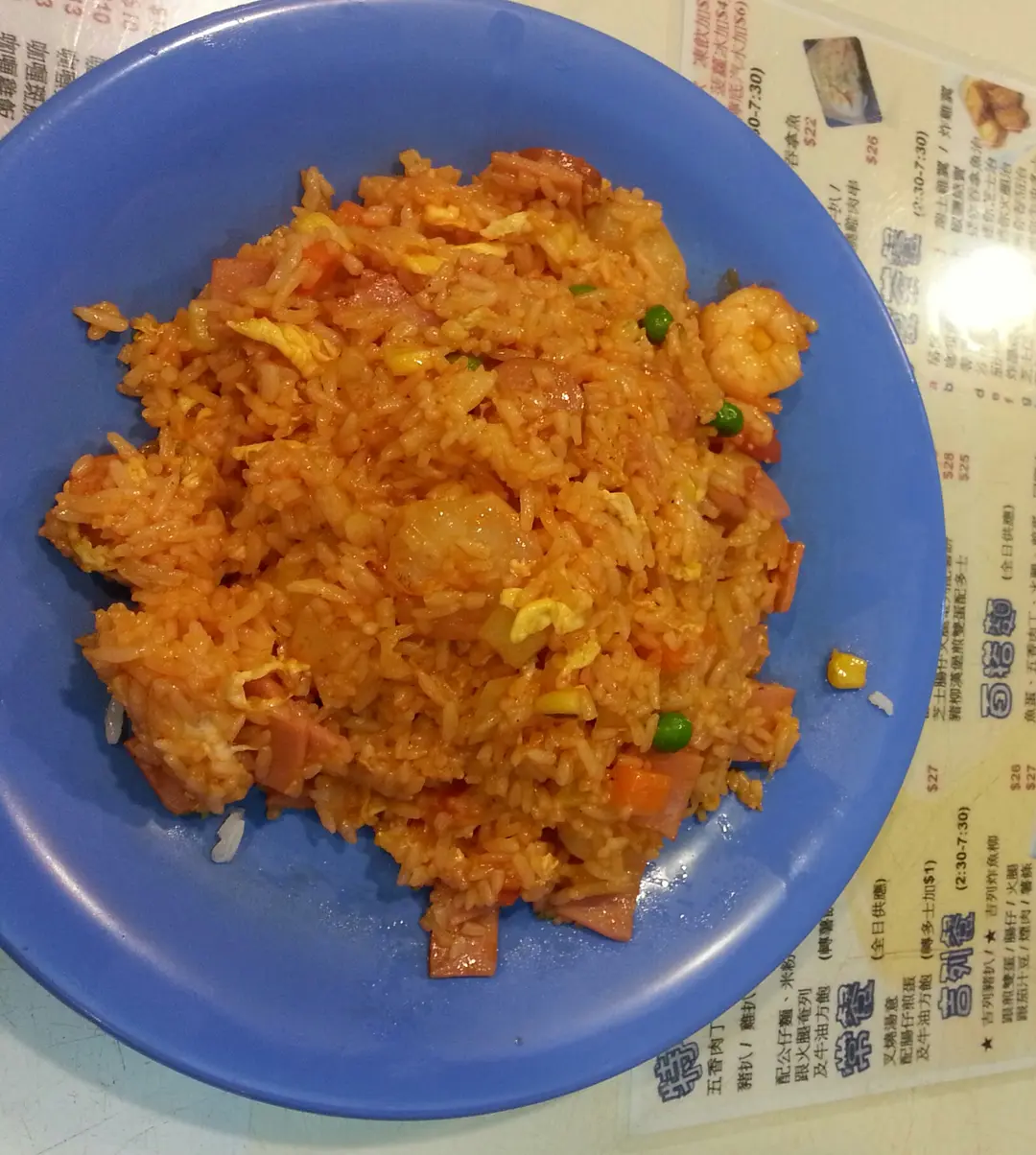 即叫即炒, 上檯熱辣辣, 茄香撲鼻,橙紅色炒飯, 配上藍色碟身, 色香味尚佳.