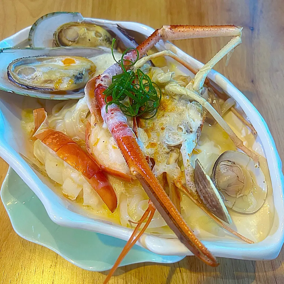 招牌雞油花雕蛋白蒸大頭蝦海鮮伴烏冬🦐 👍🏿