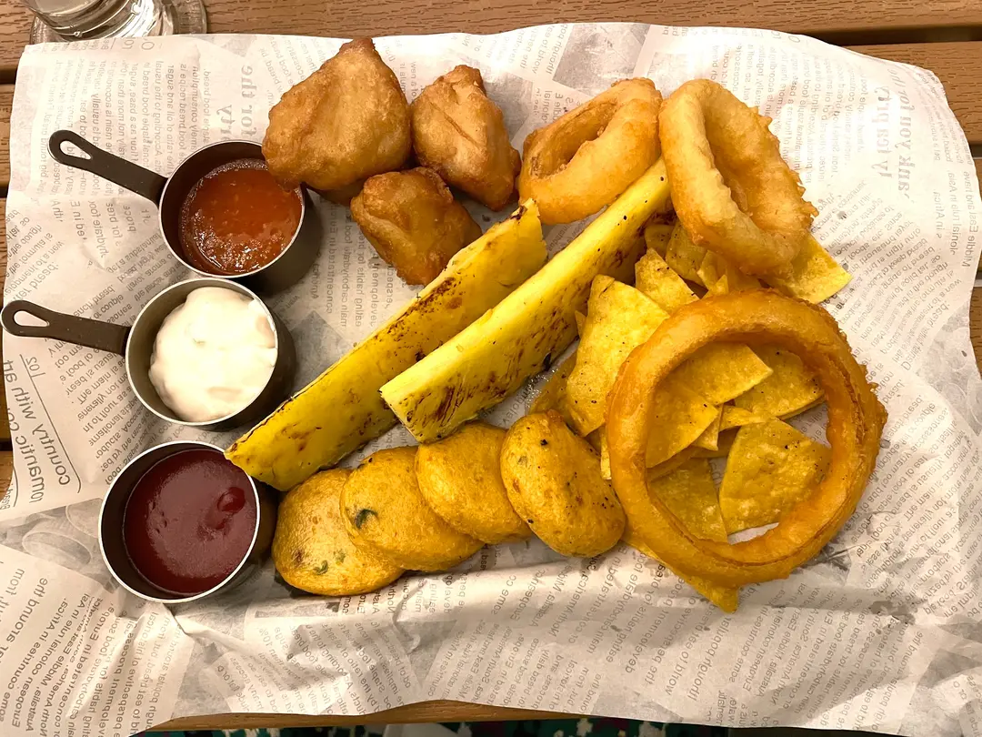 小食拼盤: 炸魚餅, 洋蔥圈, 炸雞, 燒鳳梨, 墨西哥脆餅