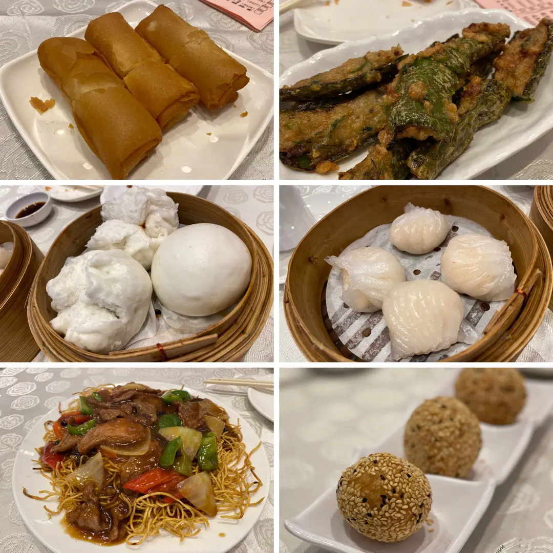 海鮮卷、煎釀尖椒、三式蒸包、蝦餃、豉椒牛肉炒麵、雷沙湯丸