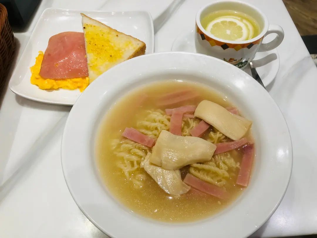 忌廉雞湯.火腿絲仿鮑片公仔麵 + 北海道3.6牛乳炒滑蛋 + 火腿 + 牛油厚多士(半件) + 熱檸檬水