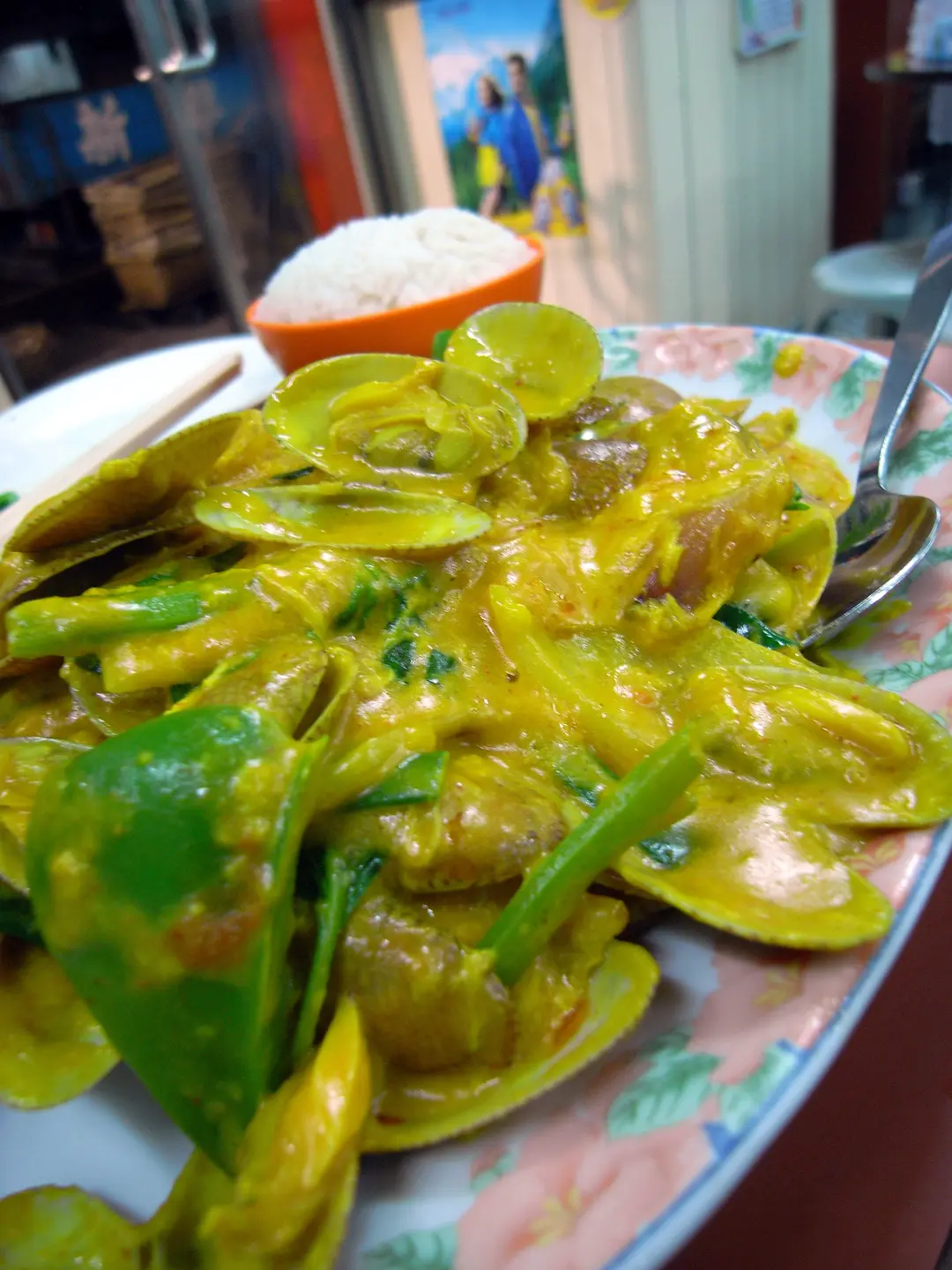 咖哩炒大蜆配白飯(配料甚豐而味濃)