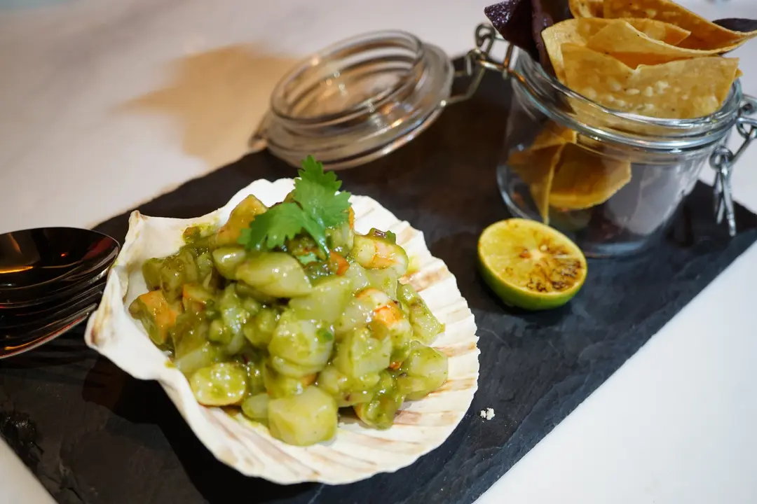 Prawns & scallop ceviche in shell (corn chips/green ceviche sauce)