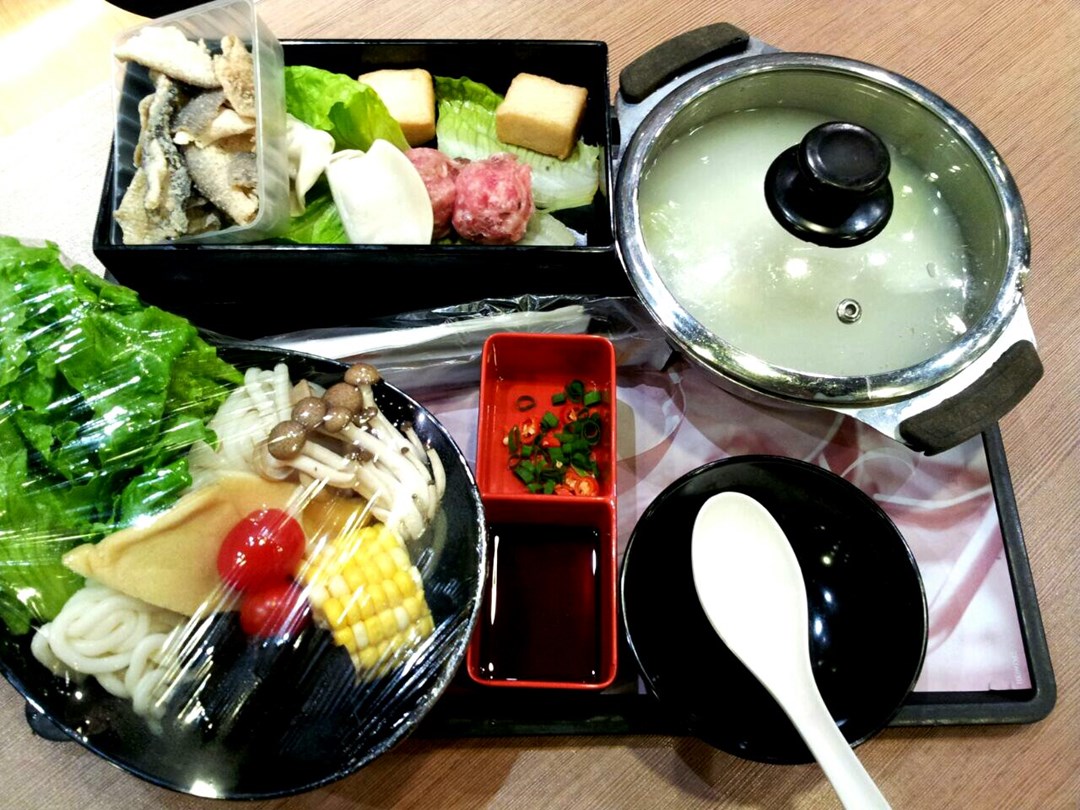 特選極嫩豚肉火鍋、配尚品盛盒、六色菜盤及烏冬