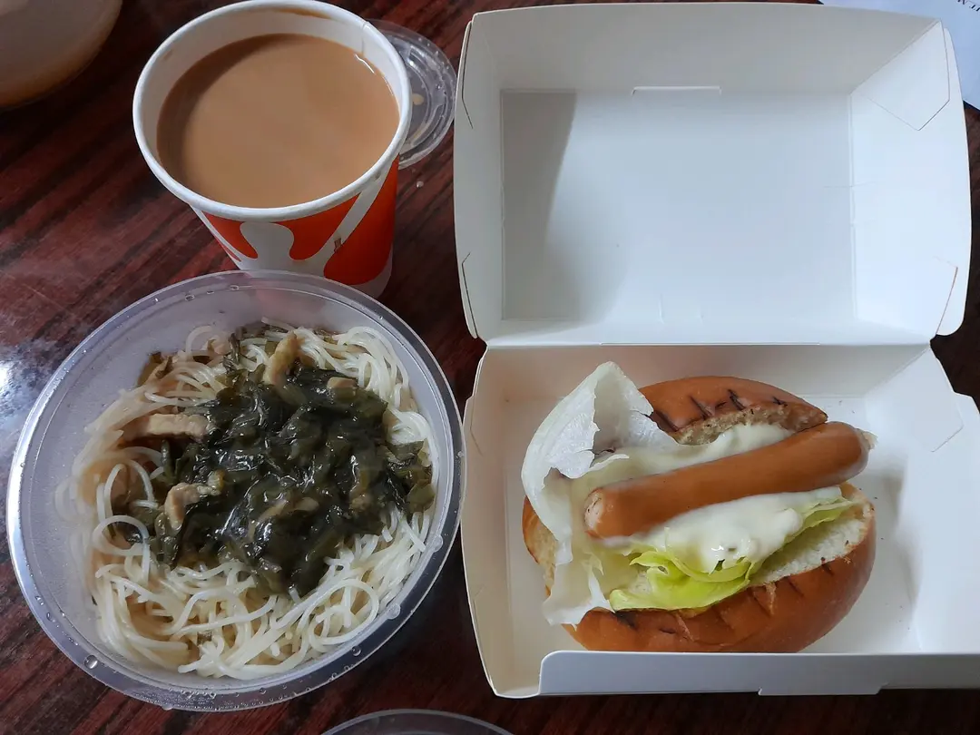 雪菜肉絲米配熱狗,同熱奶茶
