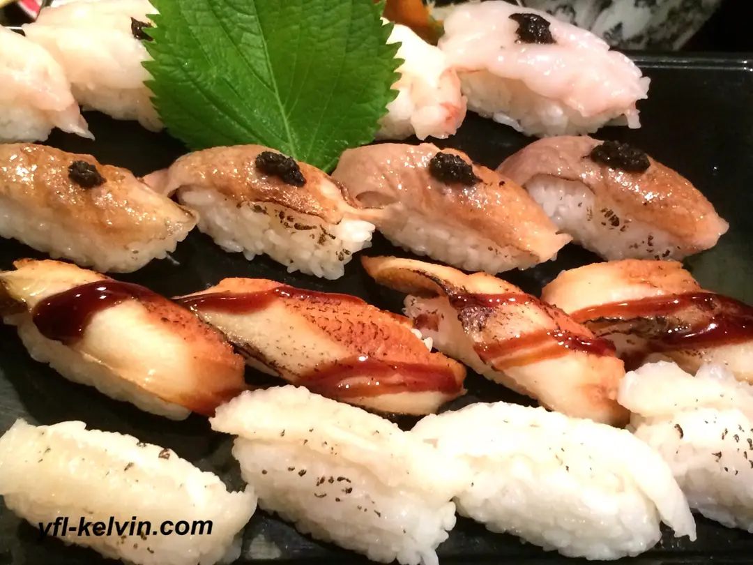 壽司: 黑松露三文魚腩、牡丹蝦、火炙池魚、火炙左口魚、蒲燒帆立貝