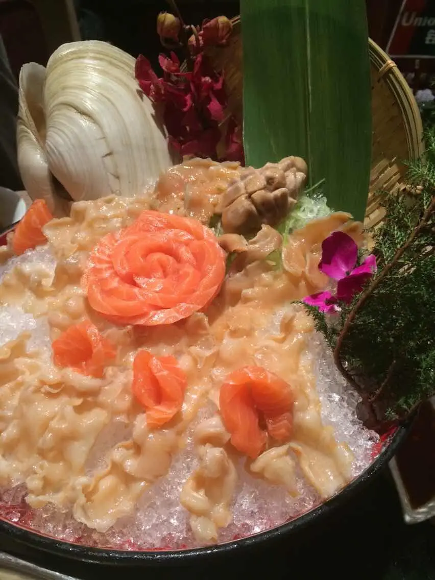 thinly sliced geoduck with salmon sashimi