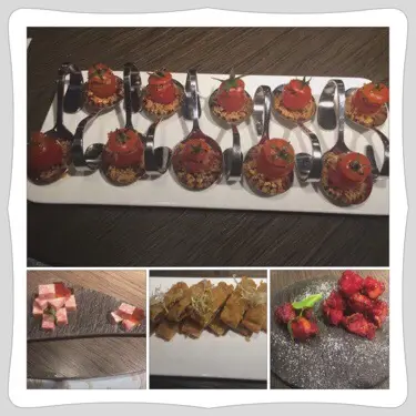 前菜:淮掦⑥綉之藜麥小番茄🍅、紅酒小肉排🐷、冰宮肴肉、松露素鹅🕊