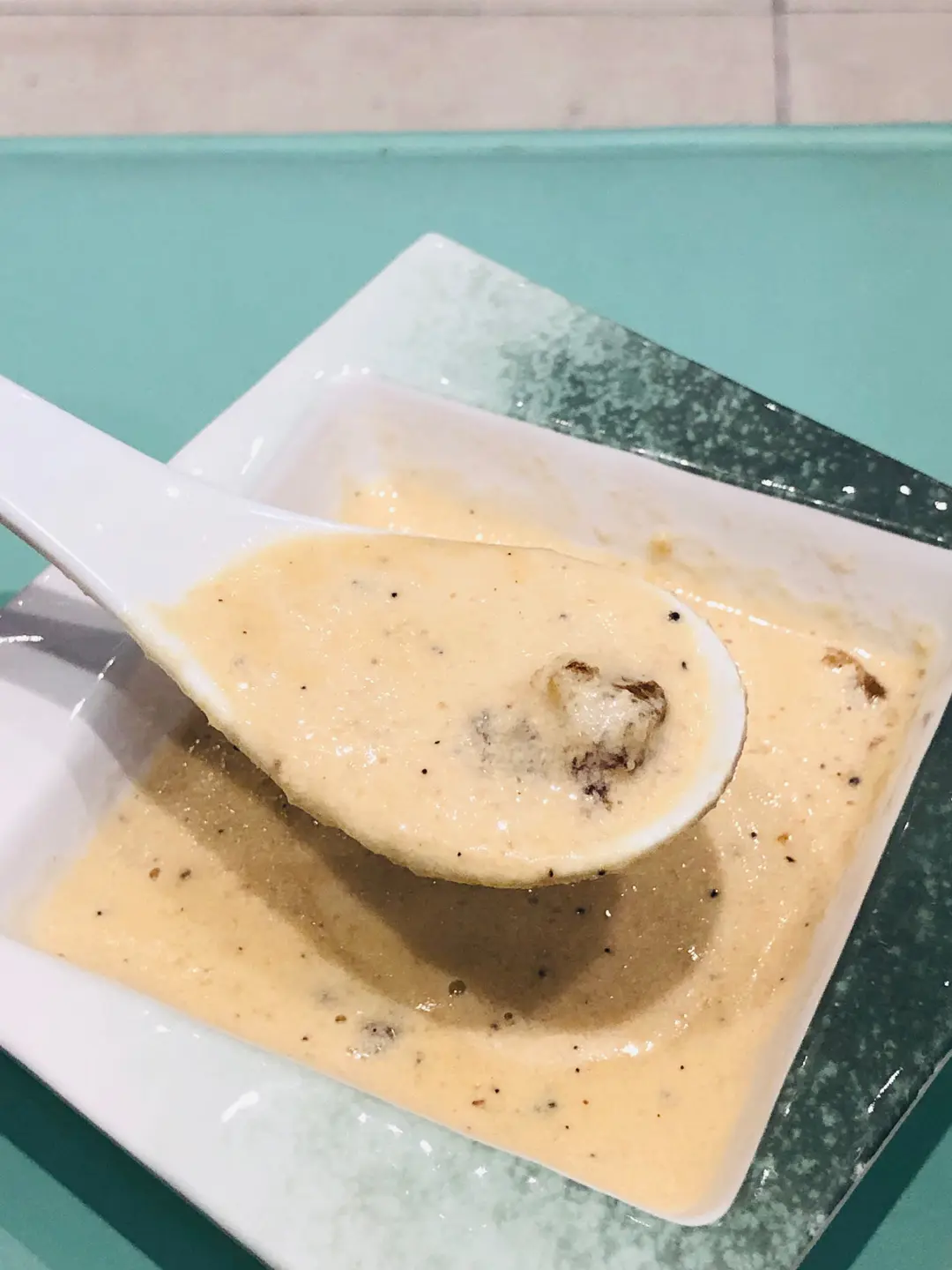 黑松露淮山桃膠忌濃湯配蜜桃红火龍果蜜瓜沙律