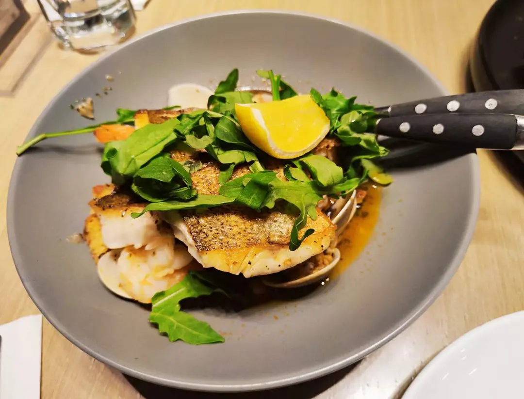 煎原條海鱸魚柳海鮮燴、鮮蝦、蜆、辣肉腸、麵包粒