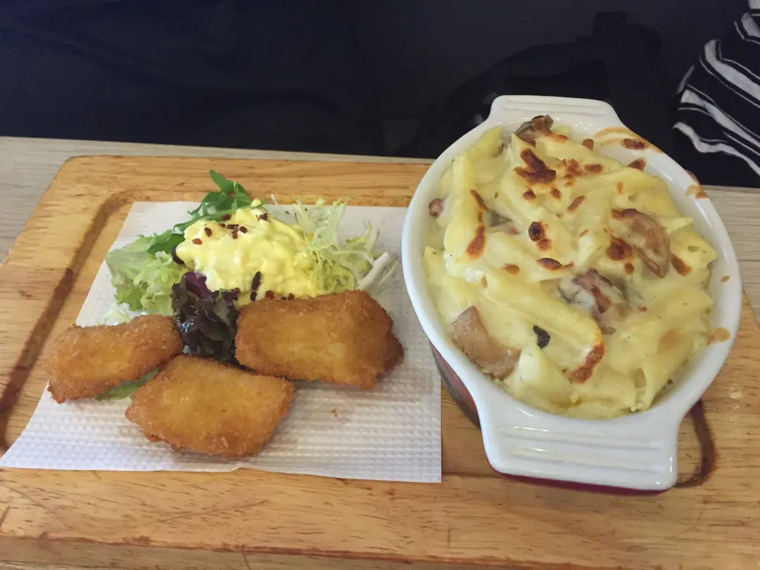 卡邦尼亞蛋黃煙肉焗長通粉(配吉列魚柳)