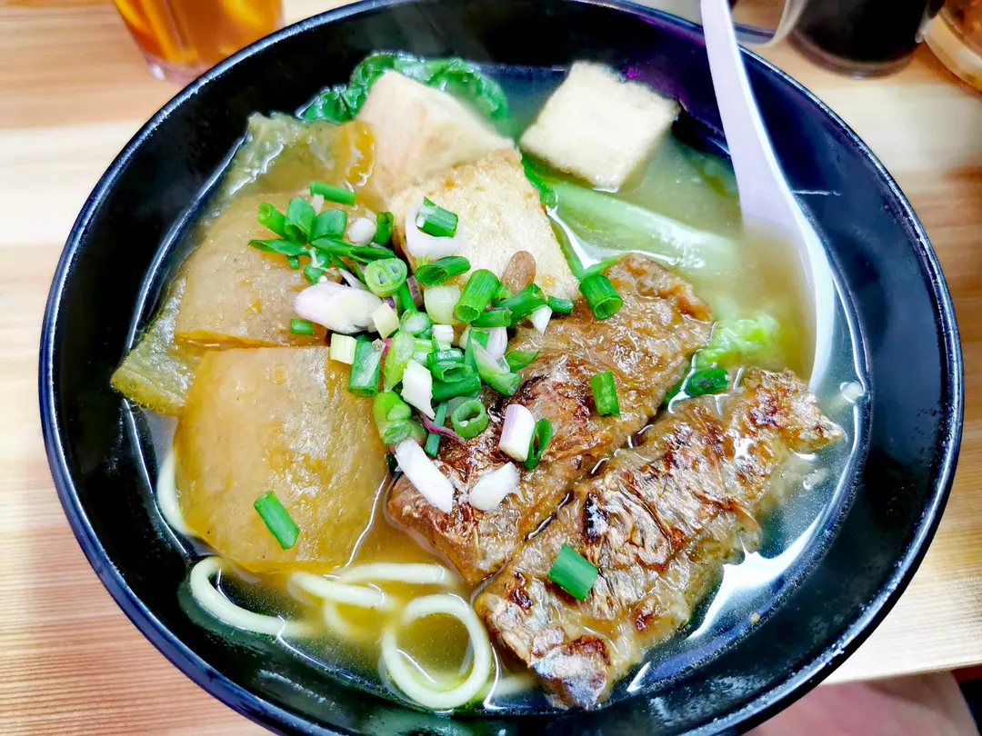 蘿蔔、魚片頭、魚肉春捲、油麵和腩汁
