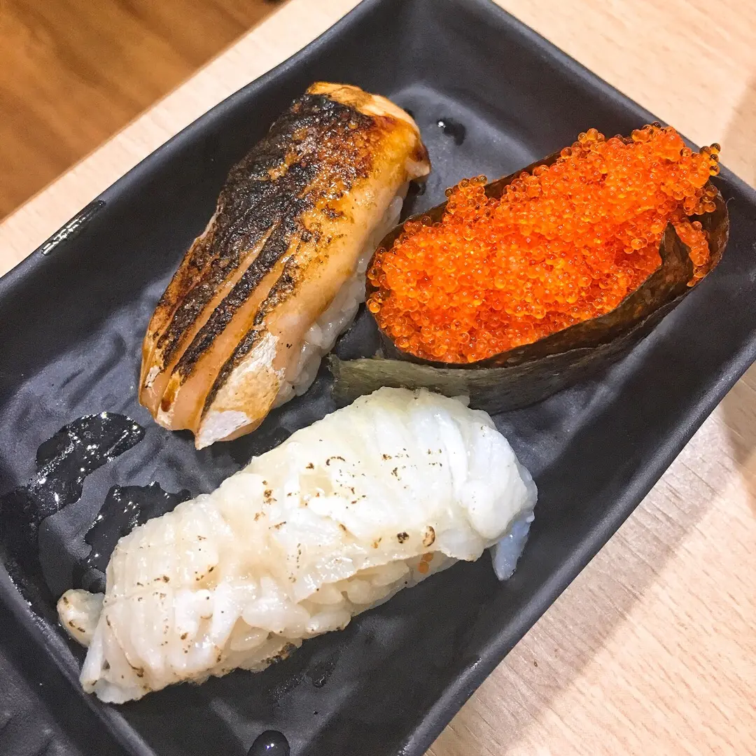 火灸左口魚邊壽司 、火灸三文魚腩壽司、蟹籽壽司