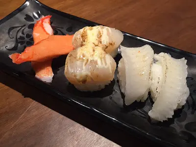 松葉蟹柳、火炙帶子壽司及左口魚裙邊壽司