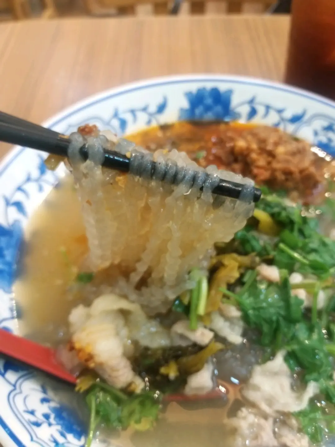 Thin potato noodle in spicy and sour soup plus fatty beef