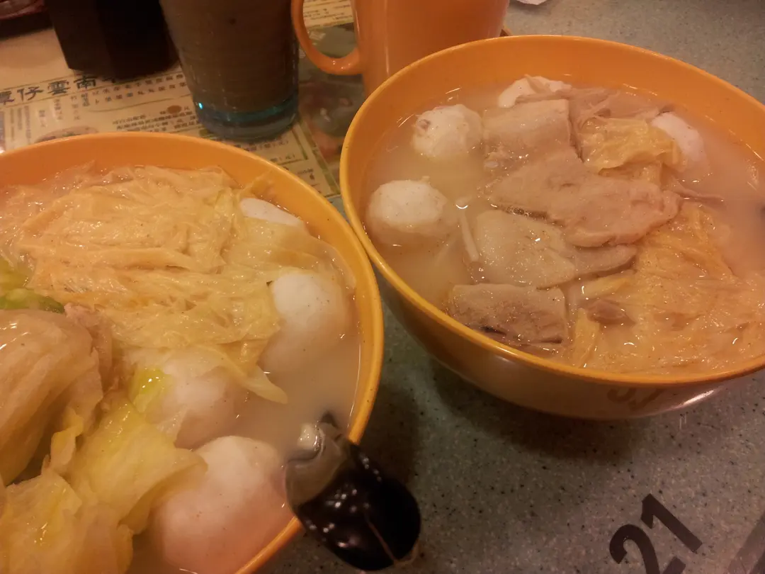 左:生菜魚旦米線, 右:腩肉墨丸米線