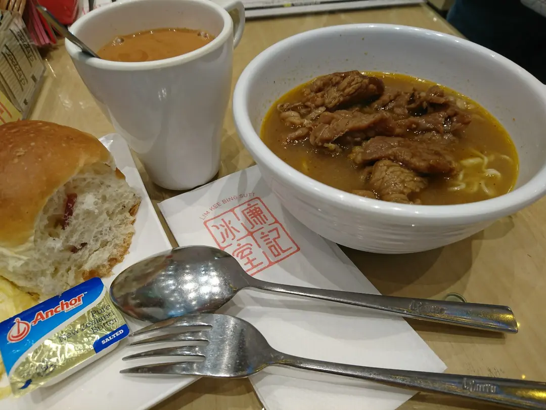 熱奶茶、沙嗲牛麵