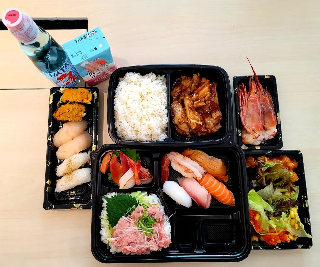 刺身配迷你吞拿魚蓉丼加壽司拼盤$108、照燒雞扒飯$40、赤蝦$28、波子汽水$10、辣味螺肉+沙律、火炙左口魚邊壽司$28、海膽軍艦$48、帶子壽司$35