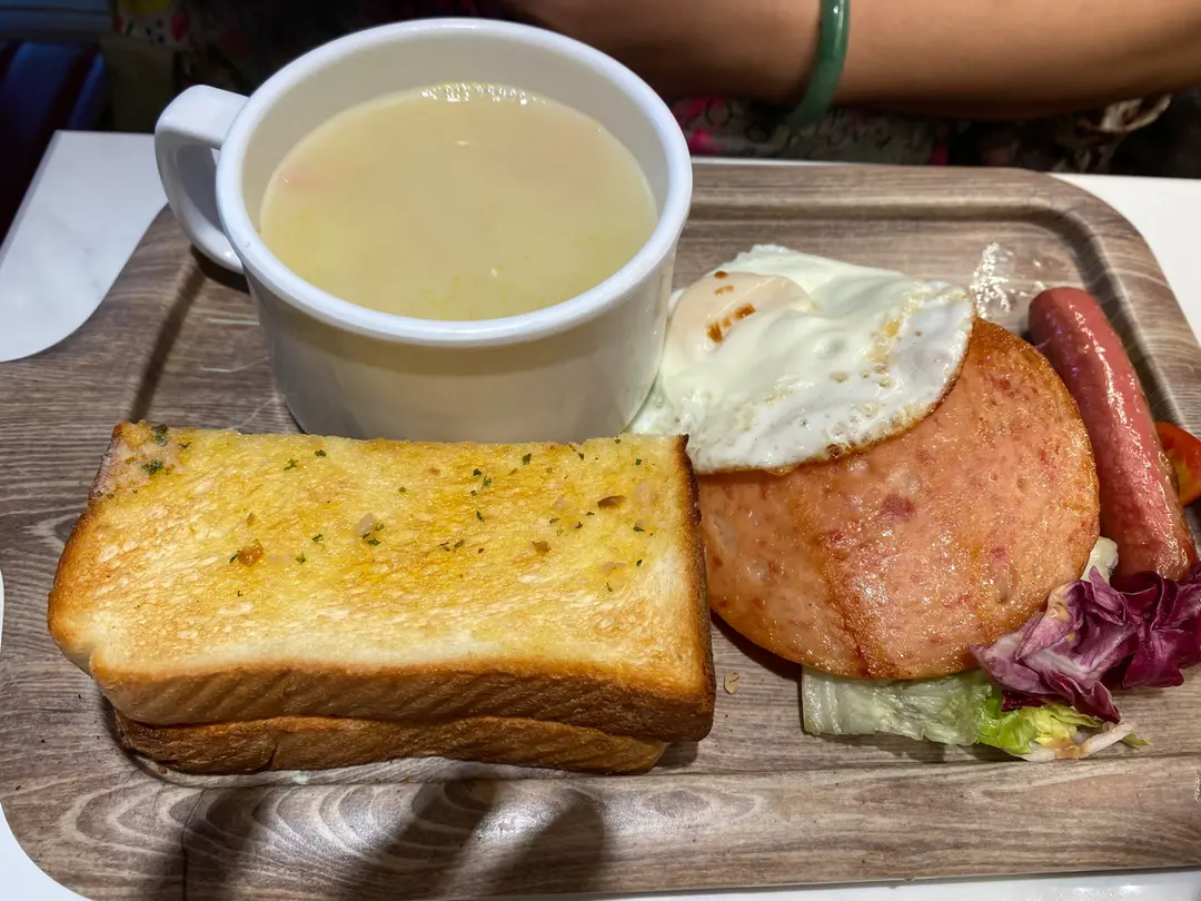 腸仔·餐肉·煎焗流心蛋·火腿濃湯通粉·蒜香牛油厚多士